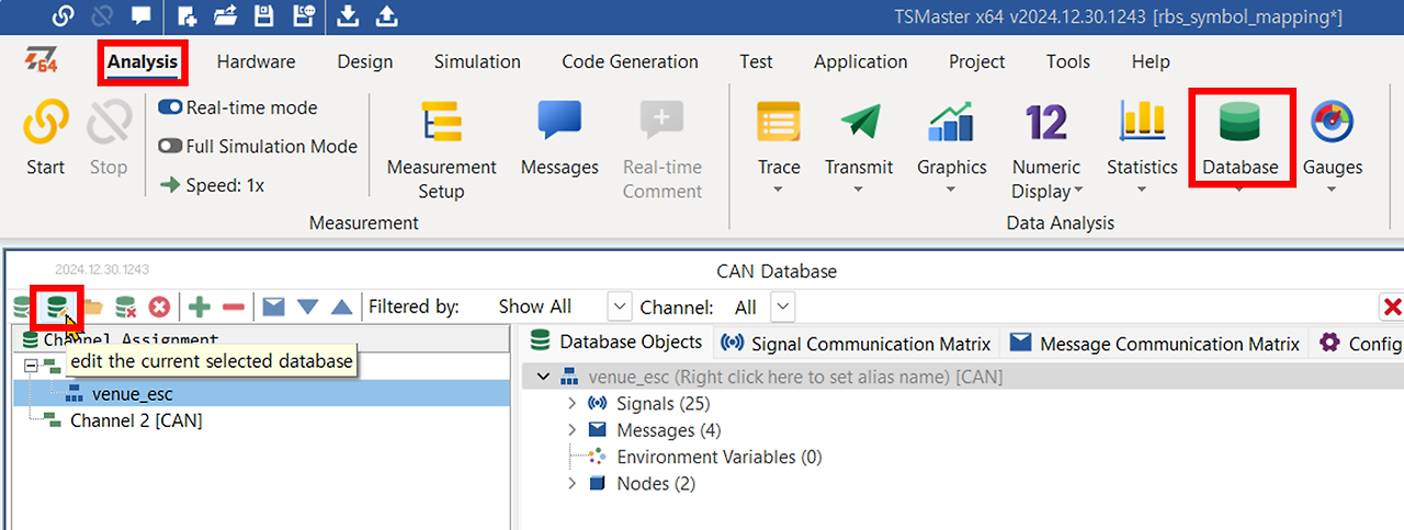 - 메인 메뉴/ Analysis/ Database 버튼을 클릭한 후 드롭다운 메뉴에서 Show CAN Database를 클릭하여 CAN Database 창을 연다. 편집할 데이터베이스를 선택한 후, CAN Database 창에서 edit the current selected database를 클릭한다. CANdb++ Editor 창이 열린다.