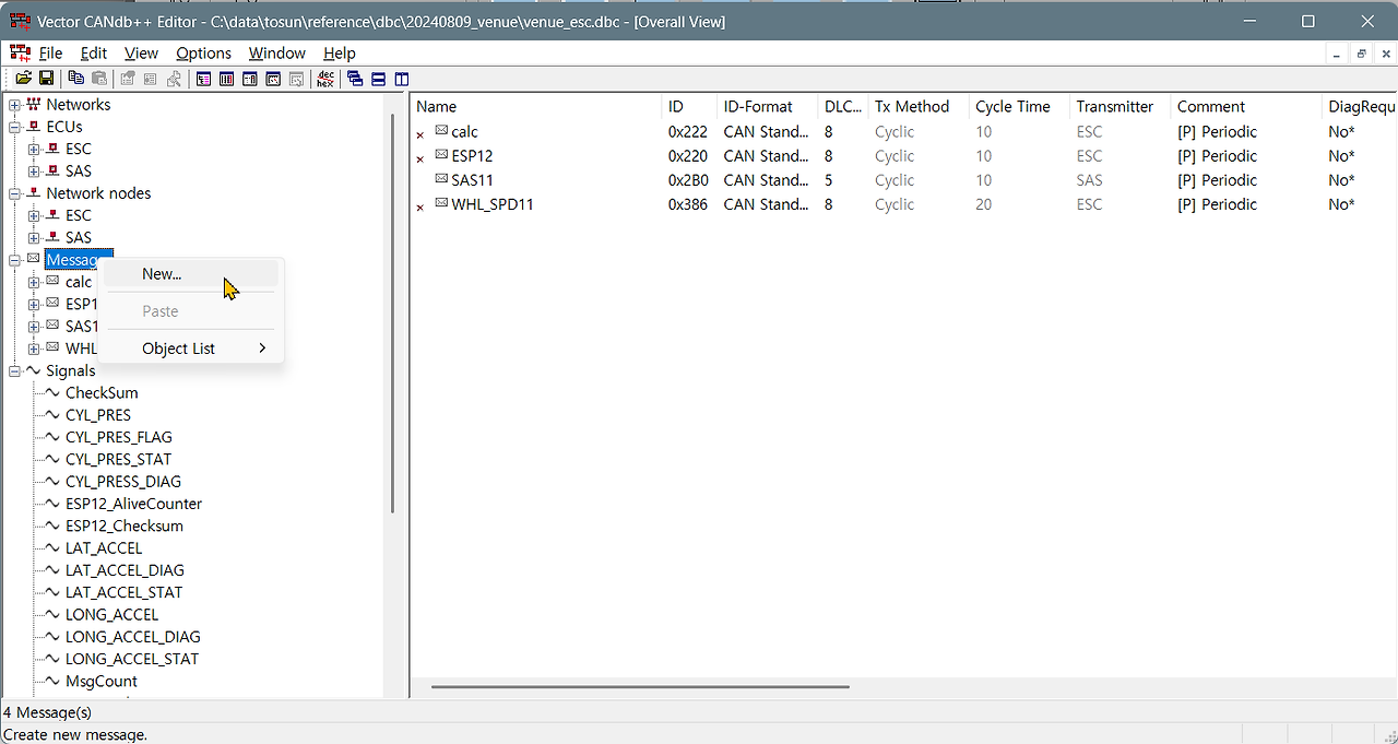 ESP12 메시지 YAW_RATE 신호의 정의. 타입이 다른 변수들 사이의 변환을 보기 위해 yaw_rate_m의 Length, Factor를 YAW_RATE와 다르게 하였다. - yaw_rate_m 신호를 담을 새 메시지 calc를 만들기 위해서, Message를 마우스 우클릭한 후 New...을 클릭하여 새 메시지 정의창을 띄운다. 이 메시지에 yaw_rate_m 신호를 담을 것이다. 이 메시지를 제어기 (Network node/ ESC)에 연결할 것이다.