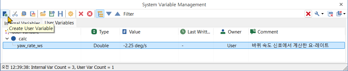 시스템 변수를 정의한다. - 미니프로그램에서 시스템 변수 calc.yaw_rate_ws를 읽어 x라는 변수에 저장하려면, 아래 코드와 같이 한다.