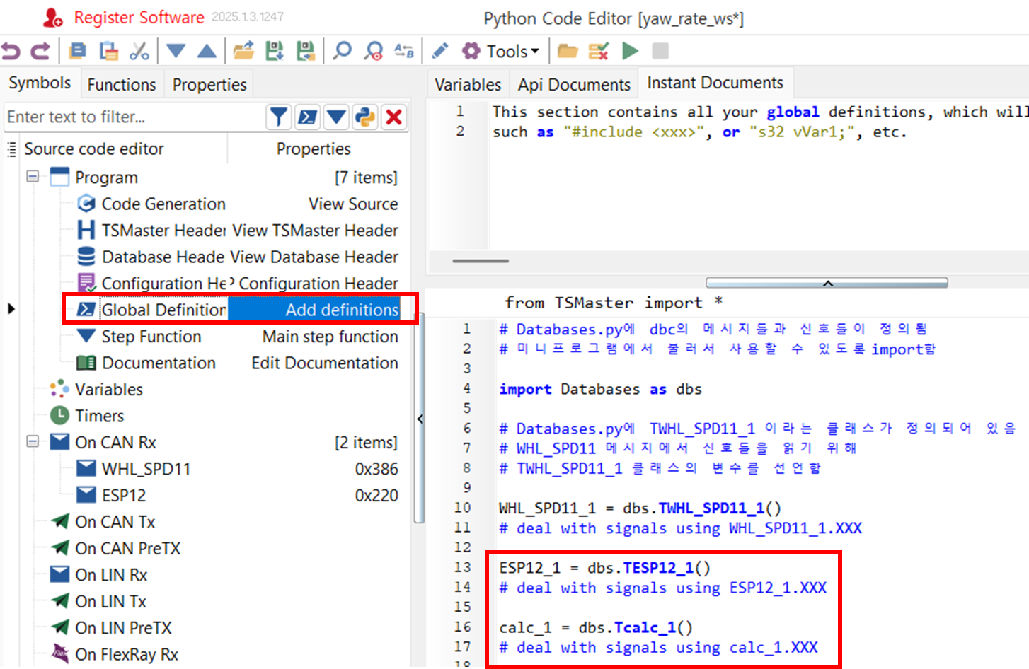 - CAN 신호를 변수에 저장할 때 fixed 포인트를 floating 포인트로 해상도와 범위 변환은 "yaw_rate = ESP12_1.YAW_RATE" 처럼 "변수 = CAN 신호"로 하면 TSMaster가 알아서 변환을 한다.