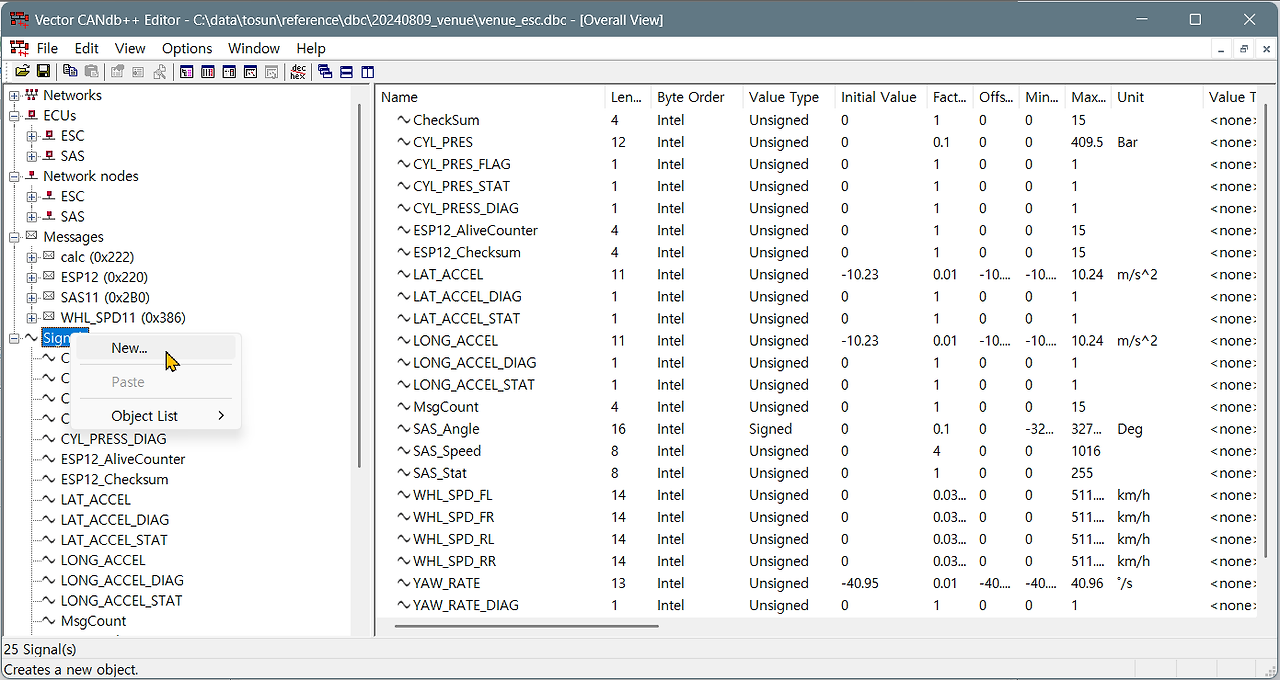 CANdb++ Editor 창의 왼쪽 영역에서 Signal을 마우스 우클릭한 후 New...을 클릭한다. - 아래 그림과 같이 새 CAN 신호 yaw_rate_m을 정의한다.