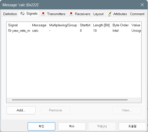 yaw_rate_m 신호를 담을 calc 메시지를 정의한다. - 메시지 정의 창에서 Signals 탭을 선택한다. 아래쪽에 있는 Add... 버튼을 클릭하여 위에서 정의한 yaw_rate_m 신호를 선택한다.