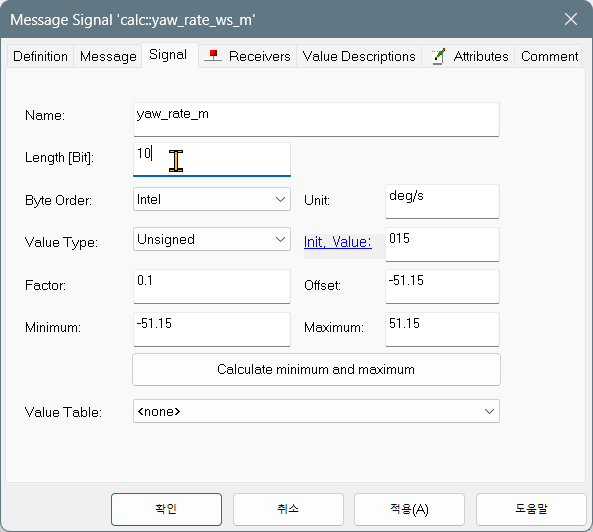 - CAN 신호 YAW_RATE와 미니프로그램의 변수 yaw_rate와 CAN 신호 yaw_rate_m는 해상도와 범위가 서로 다르다. 해상도와 범위가 서로 다른 변수들 사이에서 동일한 값이 어떻게 변환되는 지를 데모하기 위한 목적으로 length를 다르게 설정한다.
