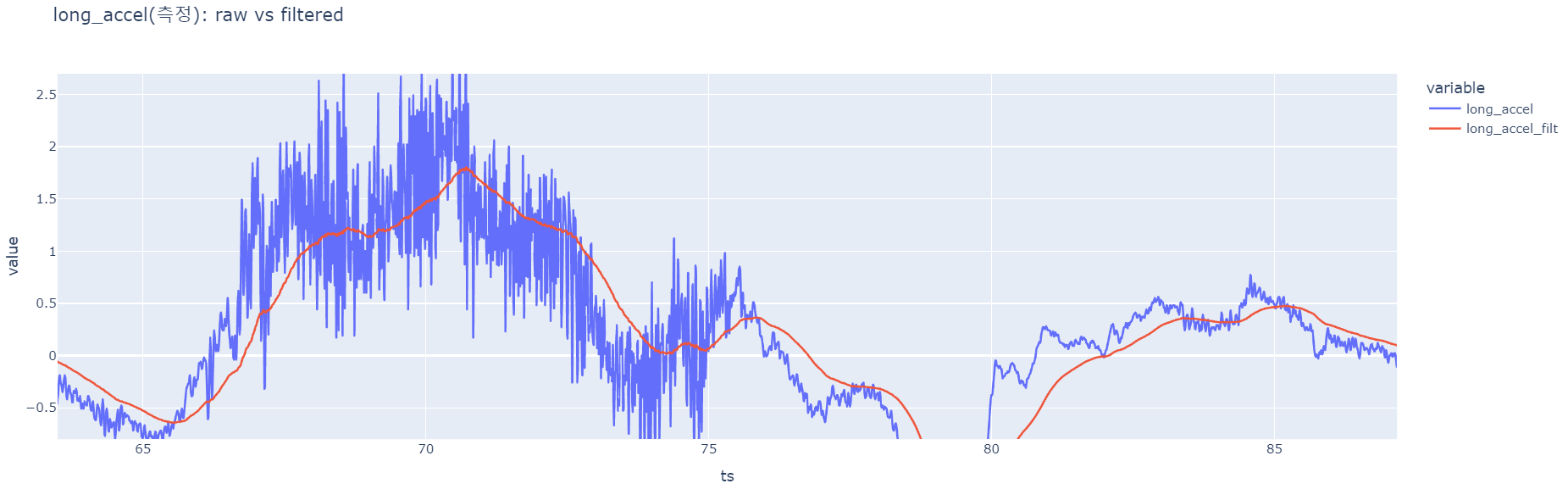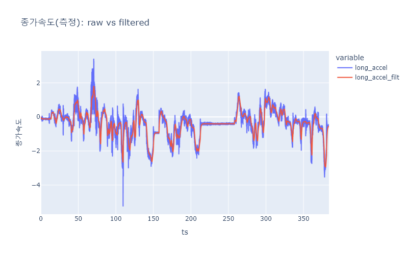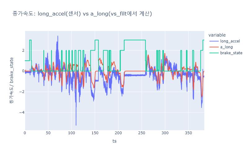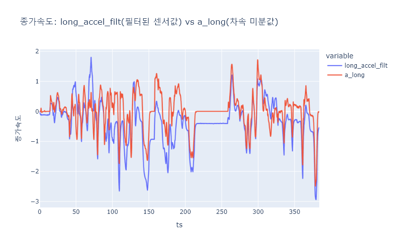 title='종가속도: long_accel_filt(필터된 센서값) vs a_long(차속 미분값)',