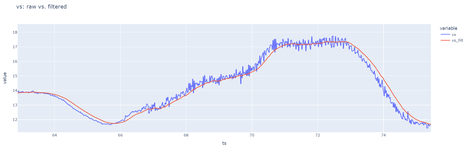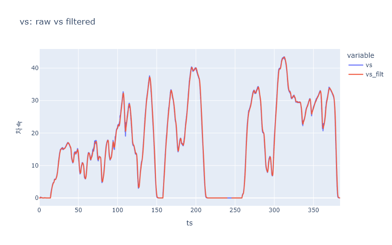fig_vs_filt = px.line(df, x='ts', y=['vs', 'vs_filt'], title='vs: raw vs filtered', width=800)