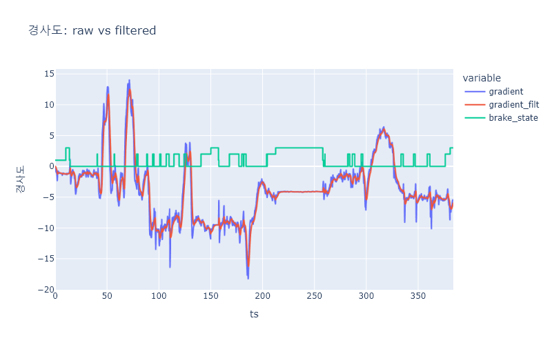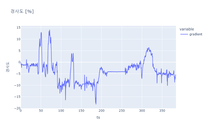 fig_gradient = px.line(df, x='ts', y=['gradient'], title='경사도 [%]', width=800)