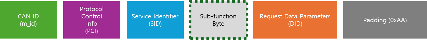UDS 진단 "요청" 메시지의 구조 - m_id는 제어기별로 지정되어 있다.