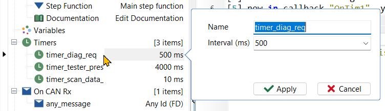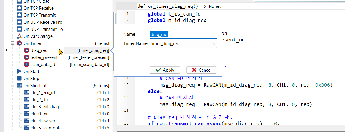 On Timer에 timer_diag_req가 트리거할 때마다 실행할 함수인 on_timer_diag_req()를 정의한다. req에 저장해둔 진단 메시지를 전송한다. - on_timer_diag_req() 함수는 아래 코드와 같다. 아래의 기능들을 수행한다.