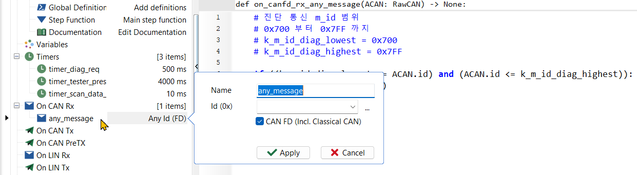 - 수신 메시지들에서 진단 메시지들 (0x700 ~ 0x7FF)을 추려서 점검해야 한다. On CAN Rx에 any_message를 대상으로 수신 메시지를 처리하는 함수 on_canfd_rx_any_message( )를 정의한다. CAN-FD뿐 아니라 CAN도 대상으로 하기 위해 CAN FD (Incl. Classical CAN) 체크 박스를 체크한다.