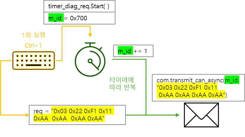timer_diag_req의 정의. 500msec 마다 진단 메시지를 전송하도록 설정하였다. - 타이머가 트리거할 때마다 m_id를 +1 만큼 증가하고 Read ECU ID 요청을 전송하도록 On Timer에 diag_req 함수를 정의한다.