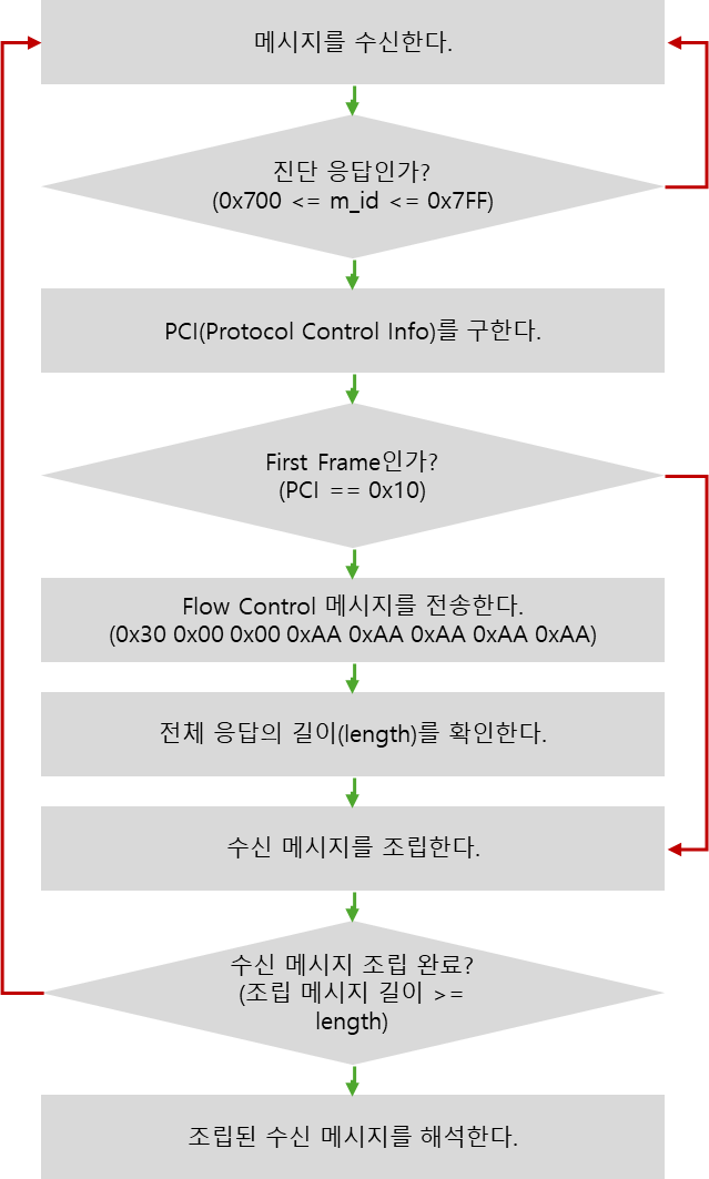 - 수신 메시지 (ACAN)의 첫 바이트 (ACAN.data[0])에서 PCI (Protocol Control Info)를 추출한다. PCI가 0x10인 경우, 응답을 여러 메시지들로 분리하여 전송할 것이며 이 메시지가 첫 메시지(First Frame)라는 의미이다. First Frame을 수신한 경우, FC (Flow Control) 메시지를 전송해야 한다.
