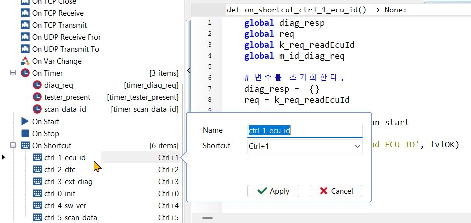 def on_timer_diag_req() -> None: global k_is_can_fd global m_id_diag_req global req global is_timer_diag_req_on global is_timer_tester_present_on m_id_diag_req += 1 # diag_req 메시지를 만든다. if k_is_can_fd: # CAN-FD 메시지 msg_diag_req = RawCAN(m_id_diag_req, 8, CH1, 0, req, 0x306) else: # CAN 메시지 msg_diag_req = RawCAN(m_id_diag_req, 8, CH1, 0, req) # diag_req 메시지를 전송한다. if com.transmit_can_async(msg_diag_req) == 0: # app.log_text(f'{msg_diag_req}', lvlOK) # 출력량이 너무 많아서 디버깅할 때만 사용한다. # 트레이스 윈도에서 전송 메시지를 확인할 수 있다. pass # 모든 m_id를 처리한 후에 timer_diag_req를 멈춘다. if m_id_diag_req >= k_m_id_scan_stop: timer_diag_req.Stop() is_timer_diag_req_on = False app.log_text('timer_diag_req stopped', lvlOK) timer_tester_present.Stop() is_timer_tester_present_on = False app.log_text('timer_tester_present stopped', lvlOK) m_id_diag_req = k_m_id_scan_start- 미니프로그램을 시작하면 timer_diag_req는 정지 상태이다. 이 타이머를 시작시켜야 한다. 그리고 req에 Read ECU ID 요청도 넣어줘야 한다. 키보드에서 Ctrl+1(Ctrl키를 누른 상태에서 숫자 1)을 누르면 이 작업이 실행되도록 한다.