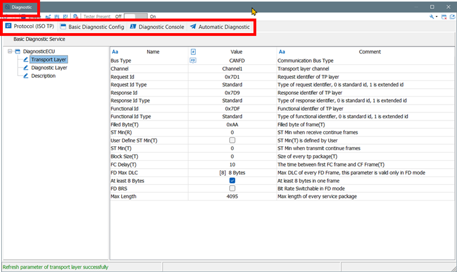 - Protocol (ISO TP), Basic Diagnostic Config, Diagnostic Console, Automatic Diagnostic