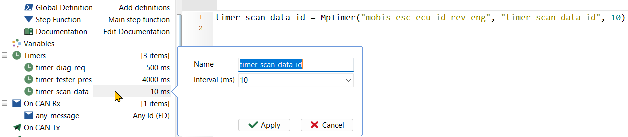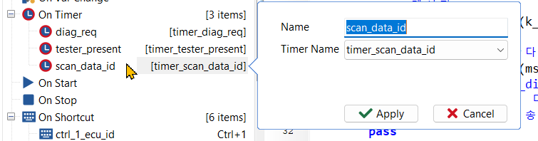 요청 메시지를 주기적으로 전송하기 위한 타이머 timer_scan_data_id를 추가한다. - timer_scan_data_id가 트리거할 때마다 실행할 함수를 정의한다. On Timer에서 마우스 우클릭하여 Add On Timer 메뉴를 선택한다. 아래 그림과 같이 Timer Name에서 timer_scan_data_id를 선택하고, Name에 scan_data_id를 입력한다.