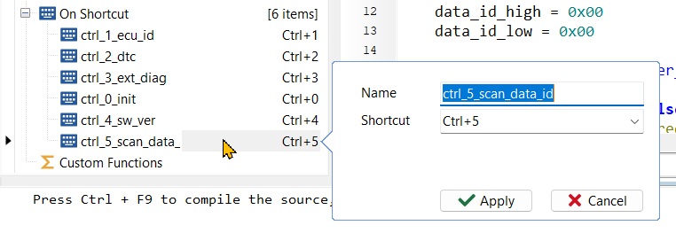 Ctrl+5 키 입력이 있으면 timer_scan_data_id를 시작하도록 한다. - on_shortcut_ctrl_5_scan_data_id() 함수를 아래 코드와 같이 정의한다. DID를 시작 값을 0x0000으로 초기화하고 timer_scan_data_id를 시작한다.