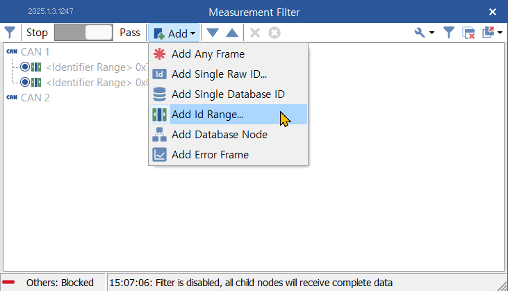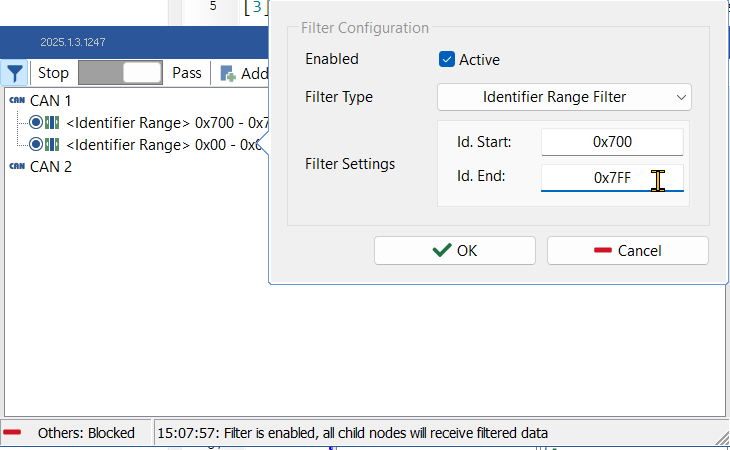 0x700에서 0x7FF 구간의 메시지들이 통과되도록 Add Id Range를 선택한다. - 범위를 0x700에서 0x7FF로 설정한다. Enabled를 Active로 체크한다.