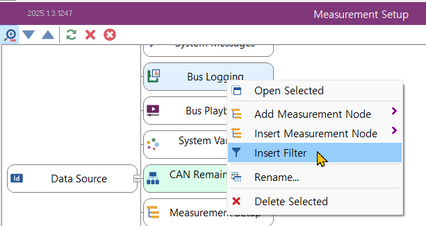 filter를 추가하기 위해 Measurement Setup 창을 연다. - Bus Logging을 선택한 후 마우스 우클릭을 한다. 팝-업 메뉴에서 Insert Filter를 선택한다.