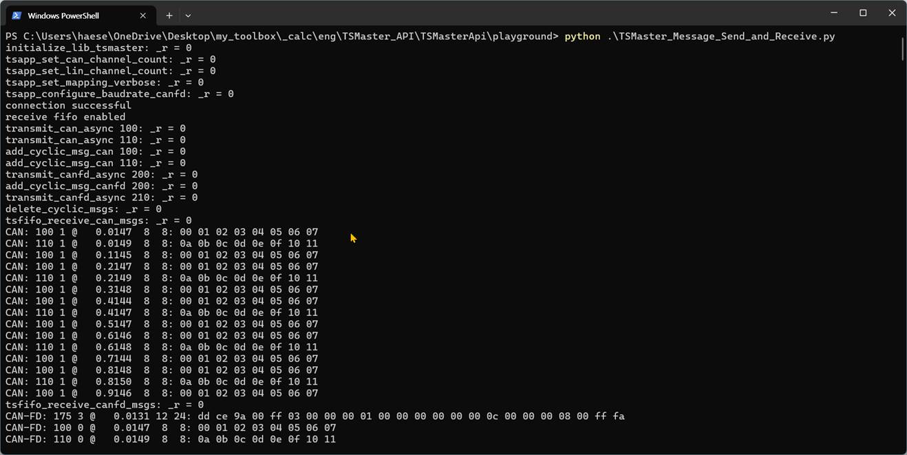 python TSMaster_Message_Send_and_Receive.py- 코드가 실행되면 CAN 인터페이스 하드웨어에 녹색 LED 등이 깜박인다.