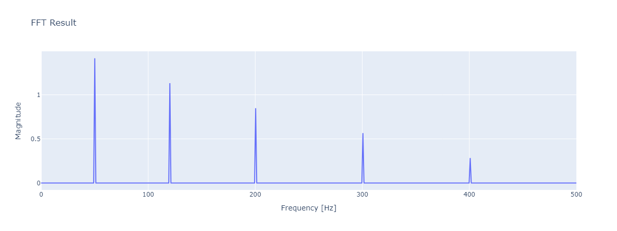 plotly.graph_objects를 사용하여 입력 신호와 FFT 결과를 그래프로 표시합니다.- 입력 신호는 시간 도메인에서, FFT 결과는 주파수 도메인에서 표시됩니다.