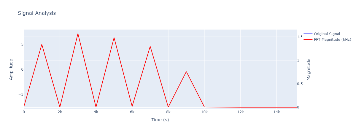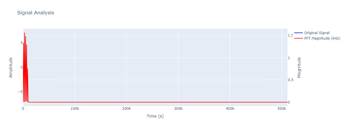 import numpy as np import plotly.graph_objects as go # Parameters num_samples = 1024 duration = 1.0 # in seconds sampling_rate = num_samples / duration # Hz frequency_components = [1, 3, 5, 7, 9] # Frequencies for sine and cosine waves (Hz) amplitude_sine = [np.random.uniform(1, 2) for _ in range(len(frequency_components))] amplitude_cosine = [np.random.uniform(1, 2) for _ in range(len(frequency_components))] # Generate time points time = np.linspace(0, duration, num_samples) # Generate each component and sum them signal = np.zeros(num_samples) for i, freq in enumerate(frequency_components): # Sine wave sine_wave = amplitude_sine[i] * np.sin(2 * np.pi * freq * time + np.random.uniform(-np.pi, np.pi)) cosine_wave = amplitude_cosine[i] * np.cos(2 * np.pi * freq * time + np.random.uniform(-np.pi, np.pi)) signal += sine_wave + cosine_wave # Compute FFT fft = np.fft.fft(signal) fft_amplitude = np.abs(fft) / num_samples # Scaling by number of samples fft_freq = np.fft.fftfreq(num_samples, 1/sampling_rate) # Prepare for plotting: Take only the positive frequencies fft_pos = fft_amplitude[:len(fft_amplitude)//2] fft_freq_pos = fft_freq[:len(fft_freq)//2] # Original signal time_trace = go.Scatter( x=time, y=signal, name='Original Signal', line=dict(color='blue') ) # FFT result with positive frequencies fft_trace = go.Scatter( x=fft_freq_pos * 1e3, # Convert Hz to kHz for better readability y=fft_pos, name='FFT Magnitude (kHz)', line=dict(color='red'), yaxis='y2' # Use secondary y-axis for clarity ) # Create layout layout = go.Layout( title='Signal Analysis', xaxis=dict(title='Time (s)', overlaying='x', side='bottom'), yaxis=dict(title='Amplitude', overlaying='left', side='left'), xaxis2=dict(title='Frequency (kHz)', overlaying='x2', side='top'), yaxis2=dict(title='Magnitude', overlaying='y2', side='right') ) # Create figure fig = go.Figure( data=[time_trace, fft_trace], layout=layout ) fig.show()Explanation: