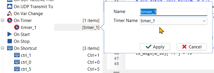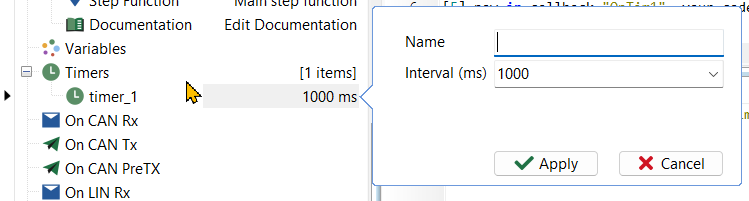 ECU_1 메시지를 1,000msec 마다 전송하기 위해 timer_1을 정의한다. - timer_1이 트리거 할 때마다 실행할 함수, on_timer_timer_1(),를 정의한다.