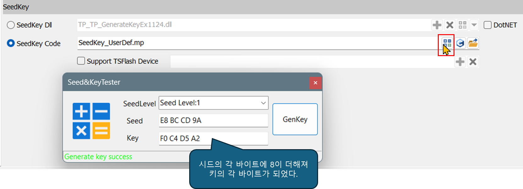 미니프로그램에 시드에서 키를 계산하는 알고리즘을 코딩한다. 예제의 경우 시드의 각 바이트에 8을 더해서 키의 각 바이트를 만든다. - 미니프로그램은 몇 가지 인터페이스를 지원한다. 시드 & 키 알고리즘 코딩 창의 맨 윗줄에서 드롭-다운 리스트를 클릭하면 지원되는 인터페이스들을 확인할 수 있다. 아래 그림에서 하이라이트되어 있는 인터페이스가 흔하게 사용된다.