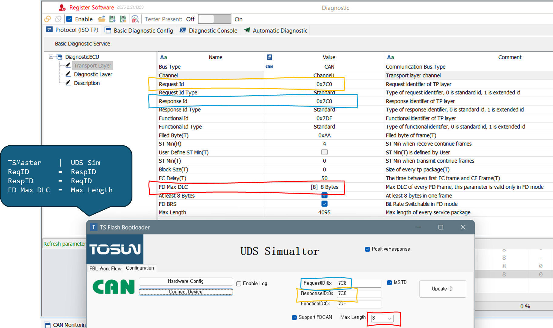 - TSMaster와 UDS Simulator에 FD Max DLC 설정이 있다. (UDS Simulator의 이름은 Max Length 이다.) 둘을 동일하게 설정하였다.
