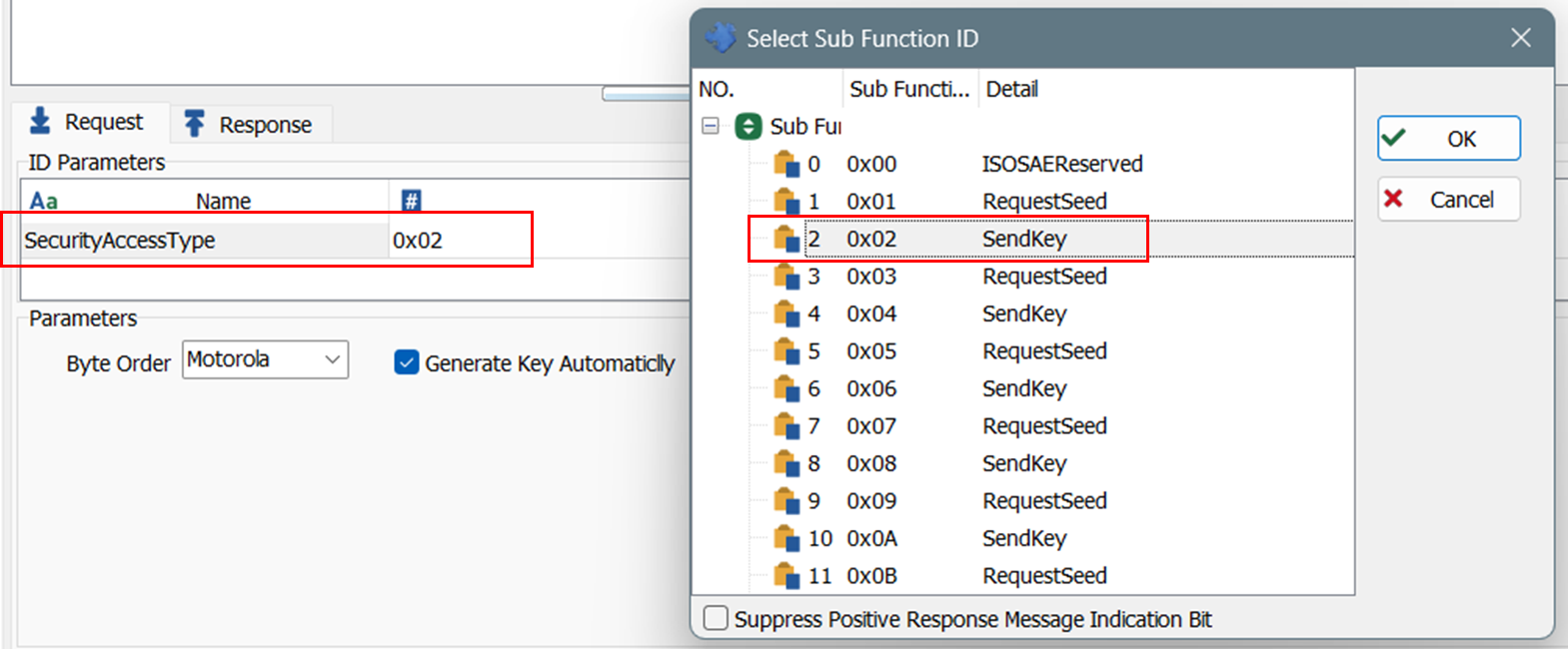 - SecurityAccessType은 입력 칸의 오른쪽 끝 '...' 버튼을 클릭하여 Select Sub Function ID 창을 열고 0x01 RequestSeed를 선택한다. RequestSeed와 SendKey는 둘이 한 쌍을 이룬다. 0x01로 시드를 요청한 경우, 0x02로 키를 전송한다. 0x03인 경우는 0x04로.