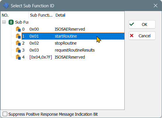 - 0x01은 루틴 제어 서비스의 시작을 요청하는 RoutineControlType 파라미터이다. RoutineControlType 칸을 선택하면 오른쪽 끝 '...' 버튼을 볼 수 있다. 이를 클릭하면 타입을 선택할 수 있는 창이 뜬다. 선택한 값에 따라 루틴을 시작시키거나, 정지시키거나, (진행 여부) 상태 회신을 요청할 수 있다.