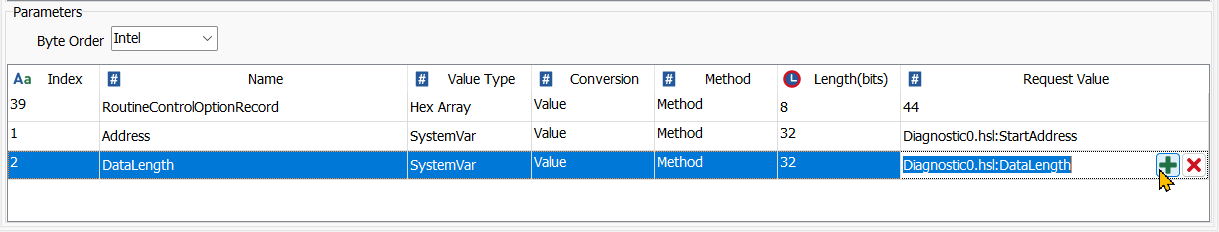 시스템 변수 창에 다운로드할 파일인 hsl을 접두어로한 변수들이 생성된다. StartAddress, DataLength, Checksum 변수들과 계산된 값들을 볼 수 있다. - Parameters에서 파라미터를 선택한 후 "+" 버튼을 클릭하고 시스템 변수 창에서 해당하는 변수를 클릭하면, 시스템 변수의 값이 파라미터의 값으로 사용된다.