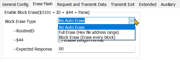 Erash Flash 설정 - Block Erase Type은 아래 그림의 선택 옵션들이 있다. 이 선택에 따라 진단기와 제어기 사이의 통신에 어떤 차이가 있는 지는 (추측은 있지만) 모르겠다. 요청에는 해당하는 파라미터가 없기 때문이다.