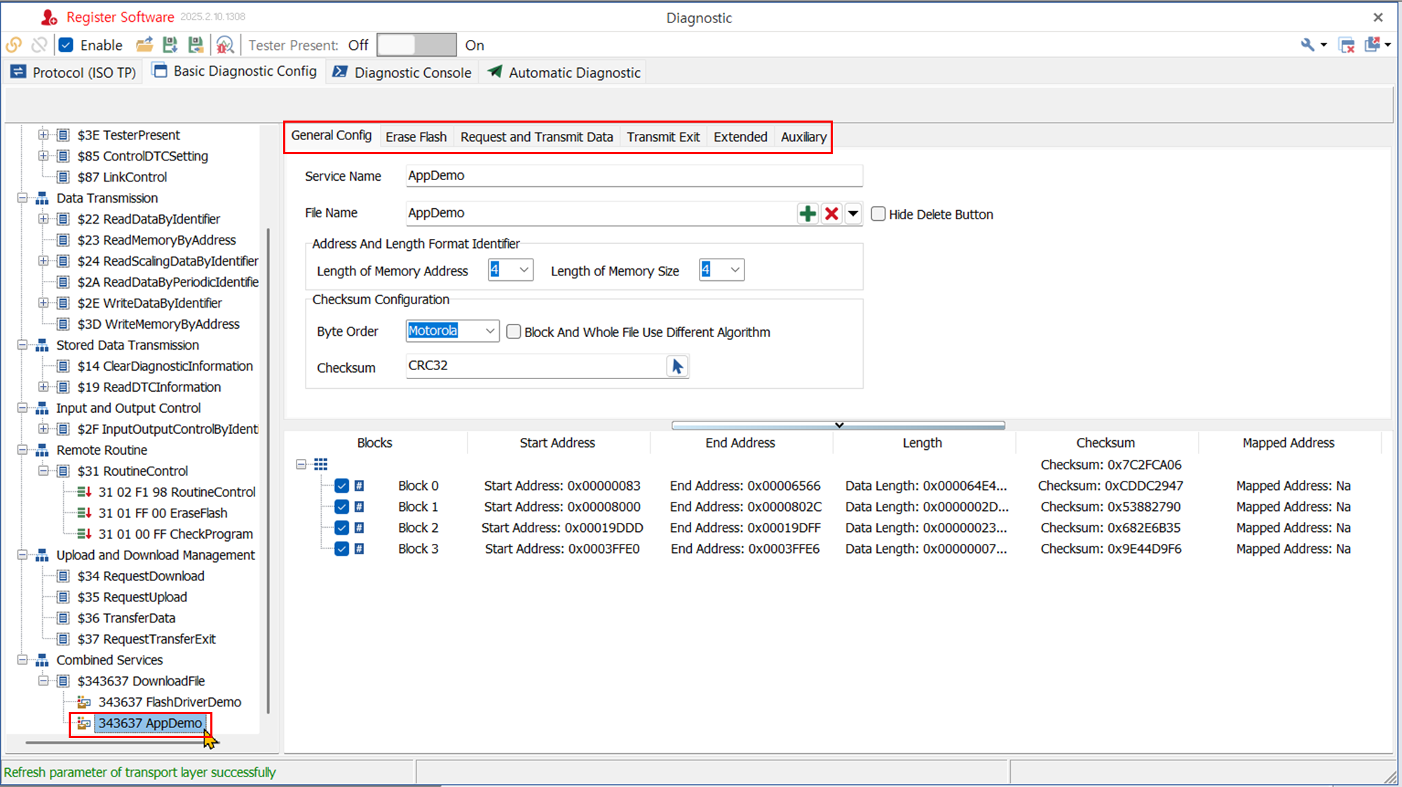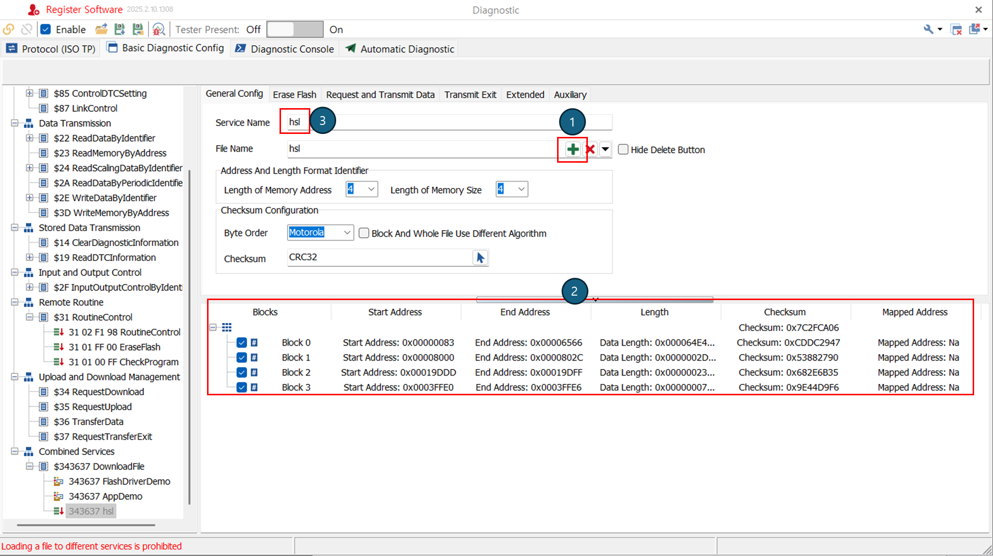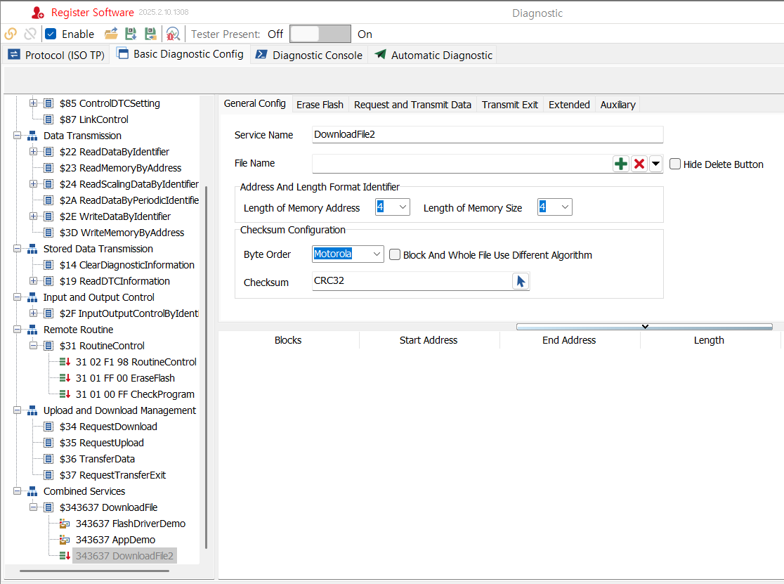 - 다운로드 요청 (서비스 아이디 0x34), 데이터 전송 (서비스 아이디 0x36), 전송 종료 (서비스 아이디 0x37)는 각각의 서비스로 분리되어 있지만 실제로는 합쳐져 실행된다. 그래서 TSMaster에는 Combined Services 라는 기능이 마련되어 있다. Diagnostic 창/ Basic Diagnostic Config 탭/ 서비스 트리/ Combined Services에 $343637 DownloadFile 서비스가 그것이다. Combined Serivces 아래에 새 서비스를 추가할 수는 없다. $343637 DownloadFile 아래에 새 서비스를 추가하는 것은 가능하다. 아래 그림에도 두 개의 서비스가 정해져 있다.