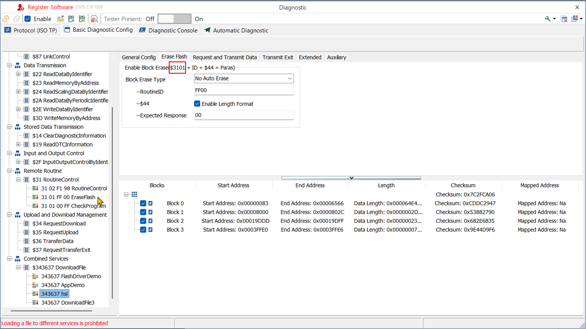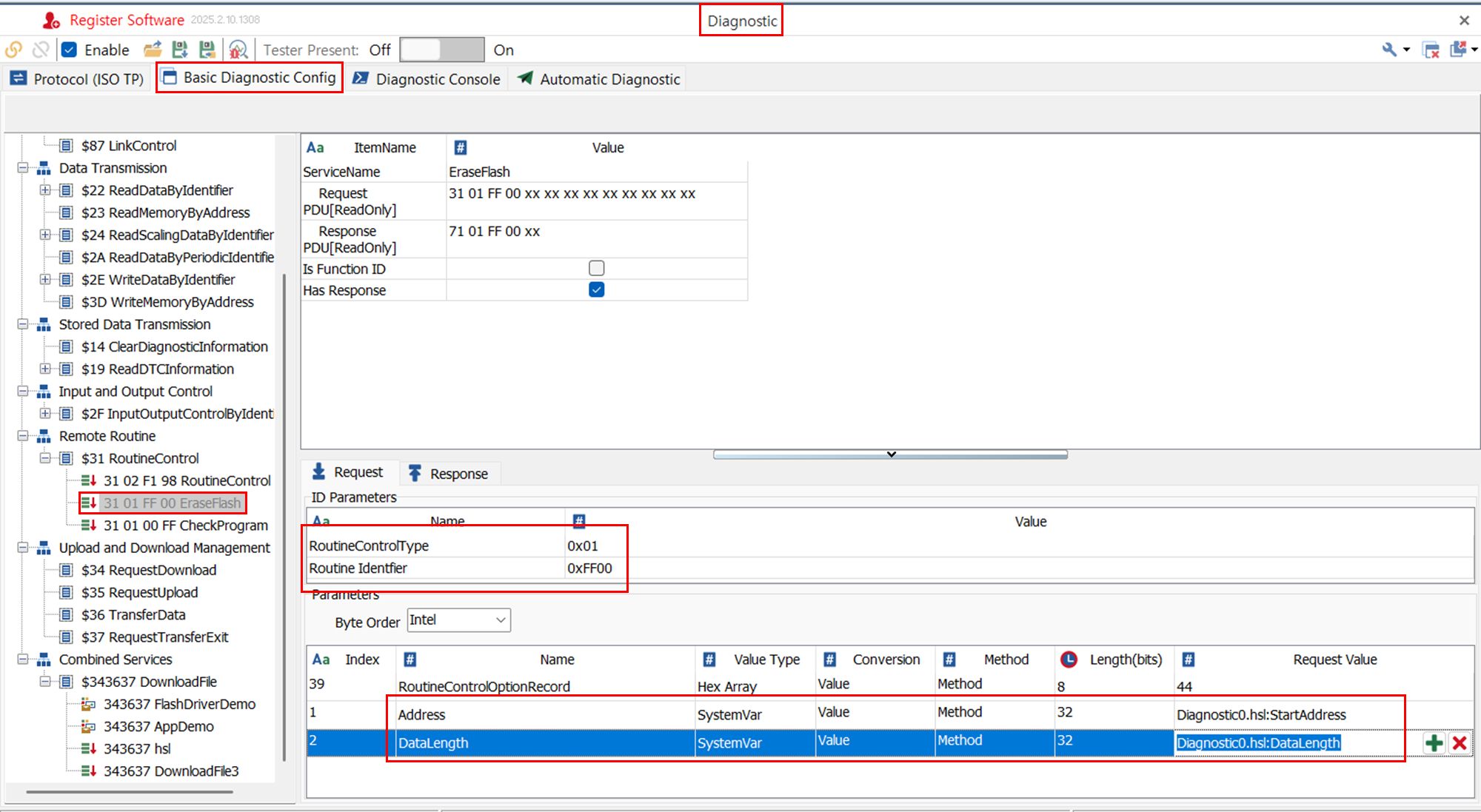 RoutineControl 서비스 설정 화면 - ErashFlash 서비스 요청은 31 01 FF 00 ss xx xx xx xx yy yy yy yy 이다. (설명을 위해 일부 xx를 ss난 yy로 변경하였다.) 이것은 예이다. 모든 EraseFlash 서버스 요청이 정확하게 이 형식으로 되어있지 않다는 의미이다. 아래에서 추가 설명한다.