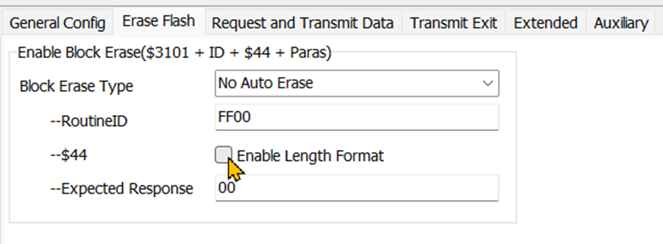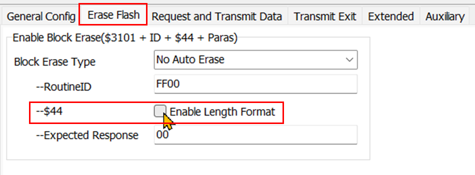 - ss의 이름은 RoutineControlOptionRecord로 되어있다. 값은 0x44이다. 나는 이 파라미터의 용도를 모른다. Erash Flash 설정 화면을 보면 Length Format으로 되어있고, 적용 여부를 선택할 수 있는 옵션이다.