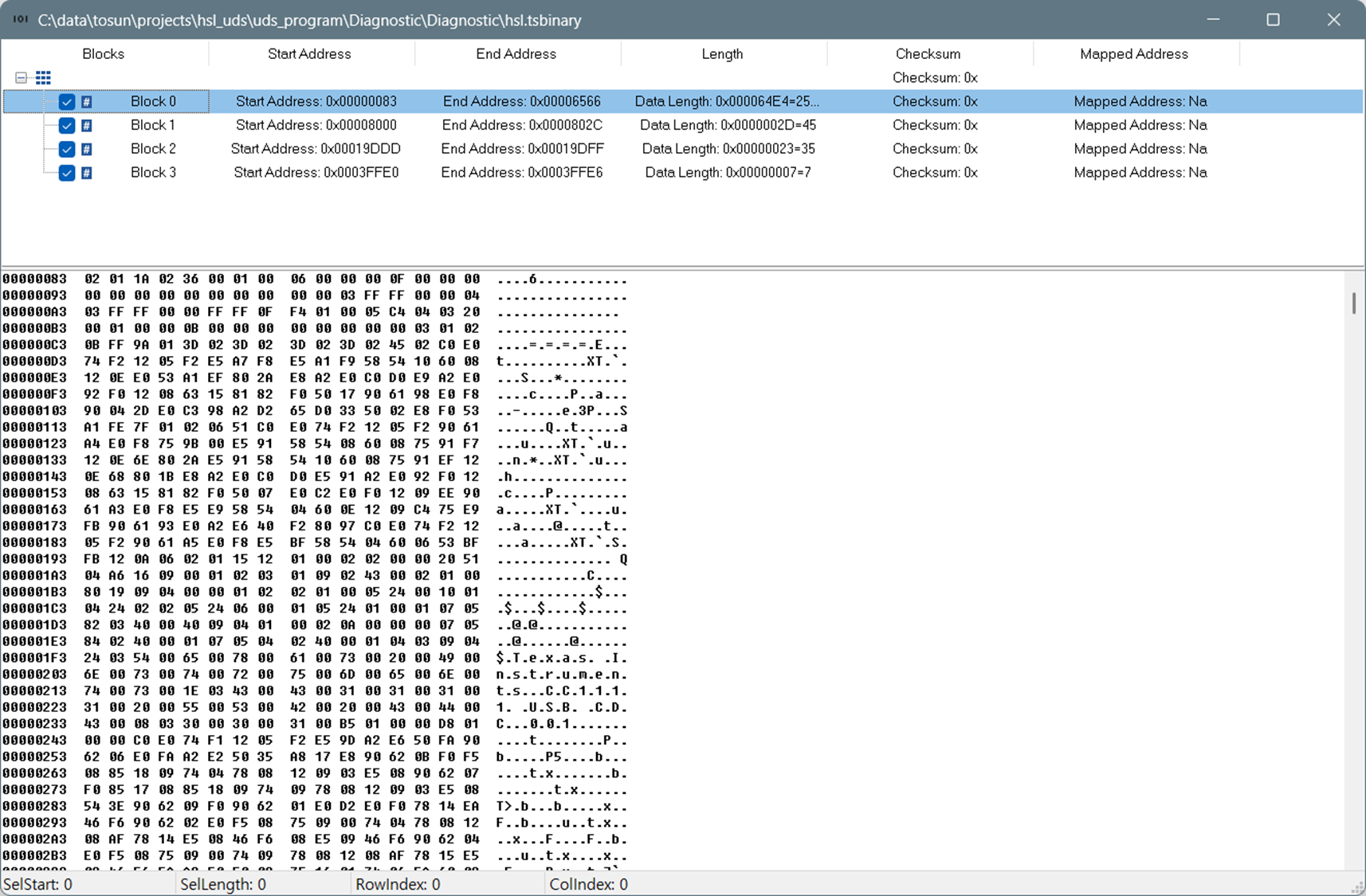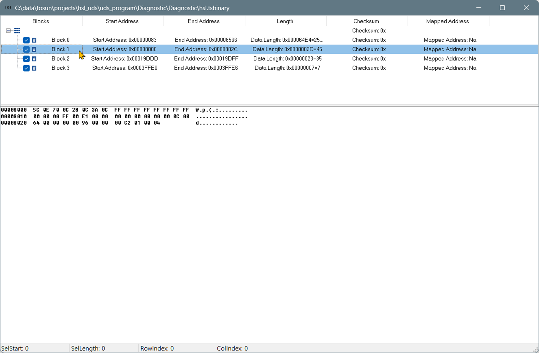 다운로드할 파일을 선택하면 블록 정보가 자동으로 채워진다. - "+" 버튼 오른쪽에 아래로 향한 삼각형 버튼을 누르면 소프트웨어의 내용을 Hex 코드로 볼 수 있다. 위쪽에 Block을 선택하면 해당 블록만 볼 수 있다.