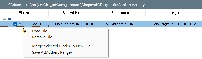 블록 영역에서 마우스 우클릭하면 추가 메뉴들을 실행할 수 있다. (나는 실험하지 않았다.) - 메모리 주소와 메모리 크기를 몇 바이트로 표시할 것인지 설정한다. 바이트 순서가 Motorola인지 Intel인지 설정한다. Checksum 계산에 어떤 알고리즘을 적용할 지 설정한다. 제어기의 하드웨어 사양과 소프트웨어 사양에 따라 설정한다.