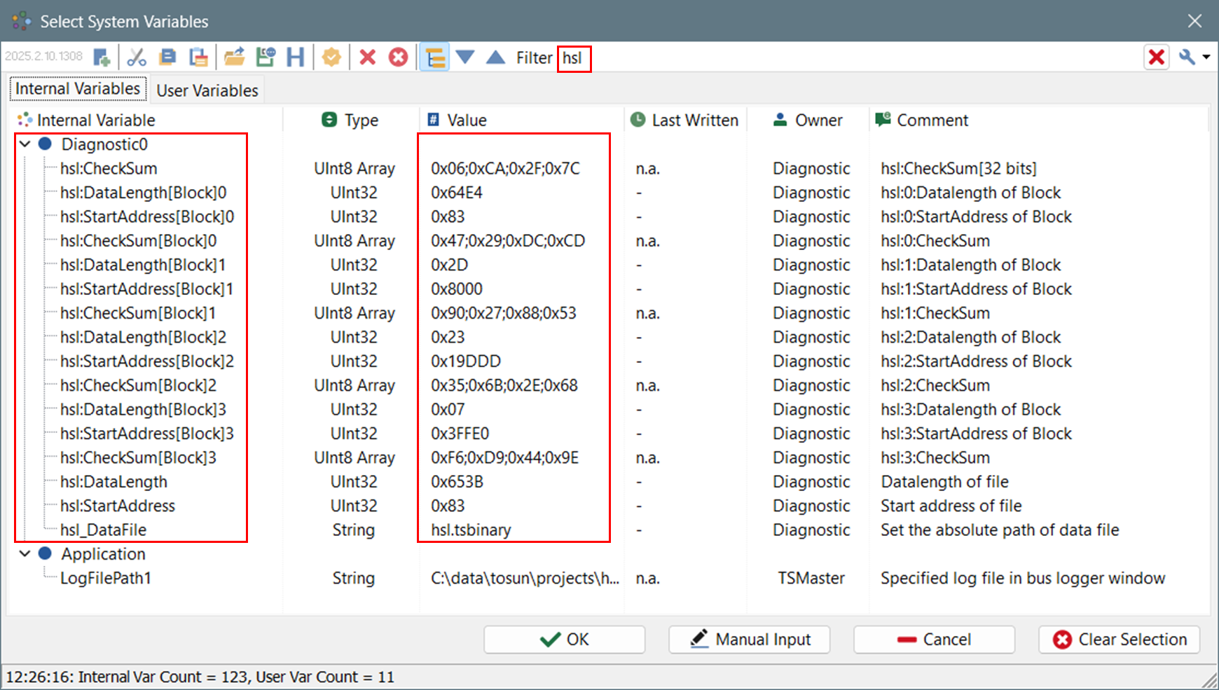 - 자동화 수준이 높고 활발한 현재는 주소와 크기를 다운로드할 파일에 맞게 자동으로 주소와 크기가 지정되도록 한다. 다운로드할 파일인 hsl을 선택하면 TSMaster는 관련 시스템 변수들을 생성한다.