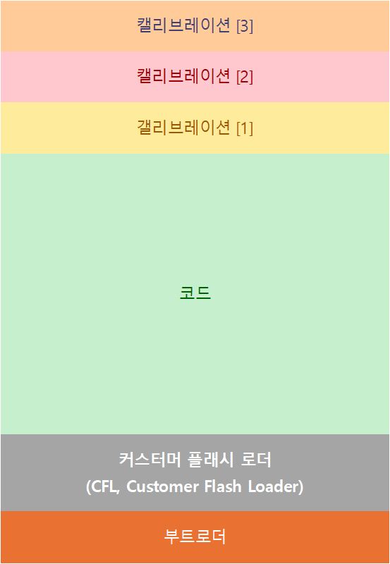 자동차 제어기의 메모리 구조 예 - 그림의 요소들을 하나씩 설명을 시도한다. 앱 영역의 코드와 캘리브레이션 부터 시작한다.