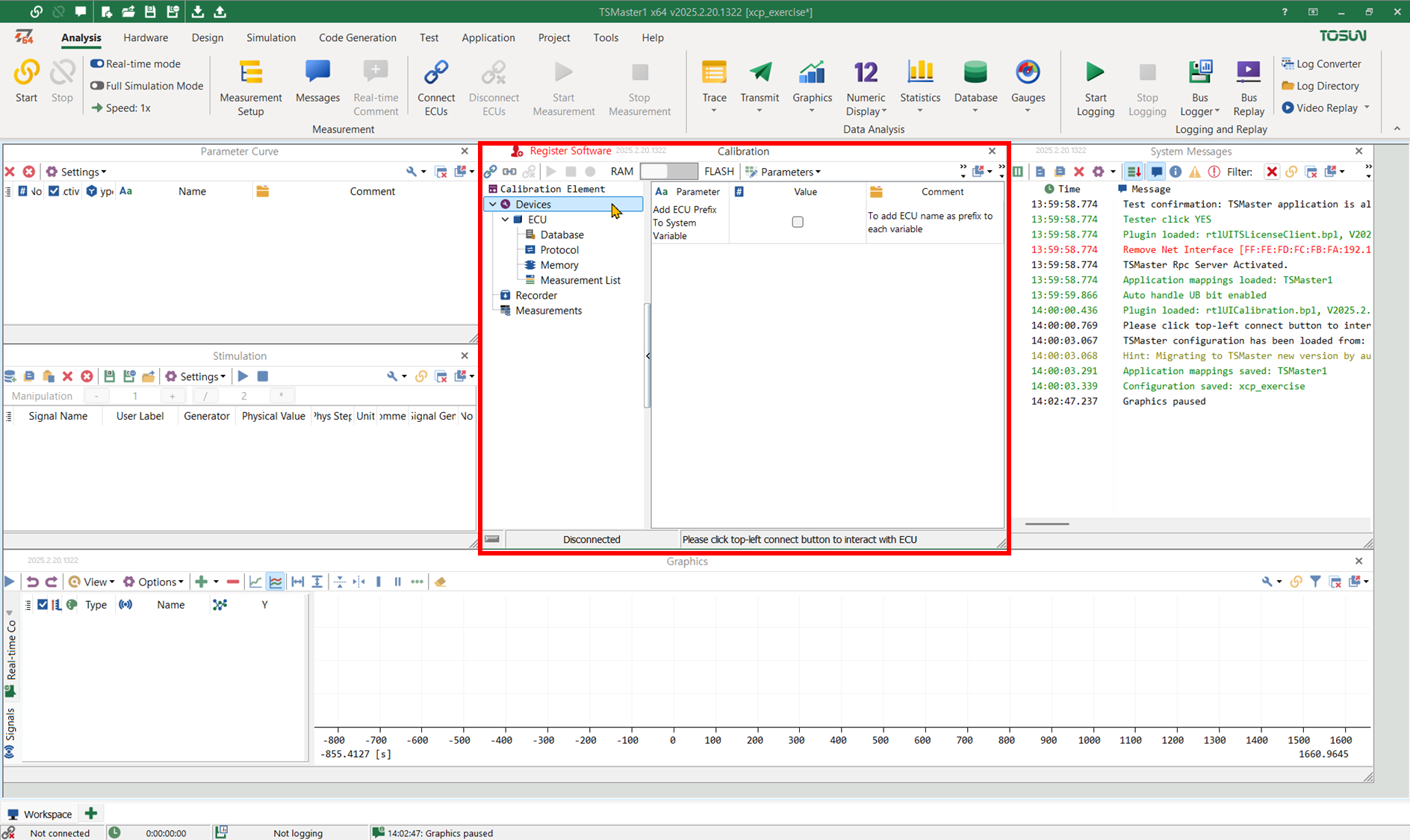 - 아래와 같이 Calibration 창이 열린다. Parameter Curve 창과 Stimulation 창이 함께 기본으로 열린다. 나는 오른쪽에 System Messages 창과 아래쪽에 Graphics 창을 추가하였다.
