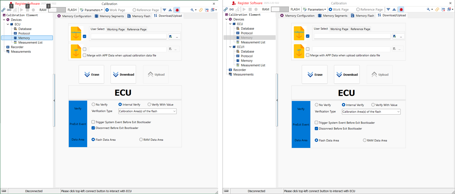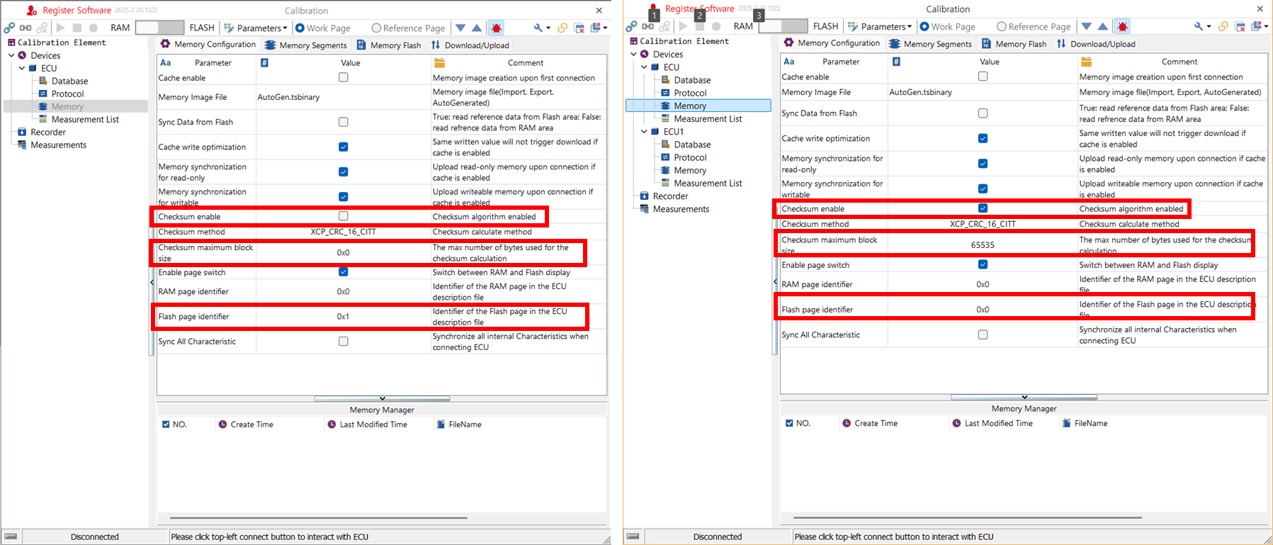 Optional Commands - a2l 로드 전/후의 Devices/ ECU/ Memory 설정의 차이는 아래와 그림들과 같다. a2l 파일에 설정 정보들이 포함되어 있다는 것을 짐작할 수 있다. 왼쪽이 전, 오른쪽이 후이다.