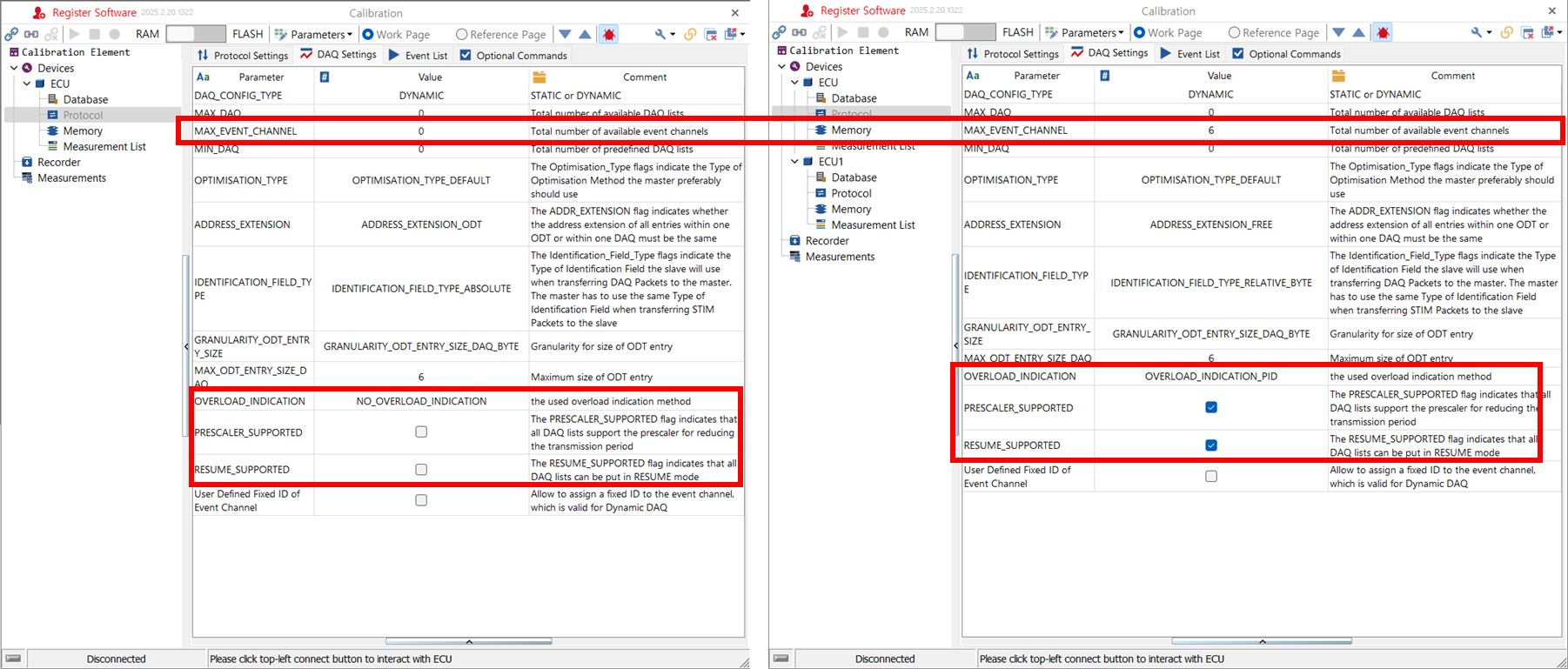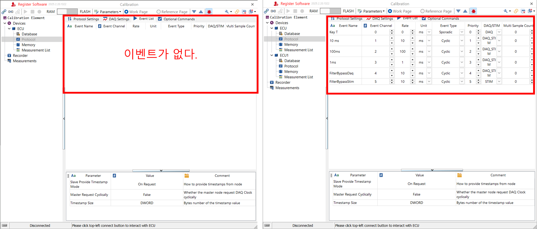 a2l을 로드한 후 Database. 신호 정보들이 있다. - a2l 로드 전/후의 Devices/ ECU/ Protocol 설정의 차이는 아래와 그림들과 같다. a2l 파일에 설정 정보들이 포함되어 있다는 것을 짐작할 수 있다. 왼쪽이 전, 오른쪽이 후이다.