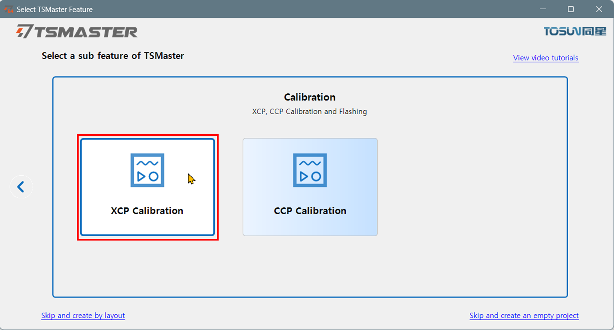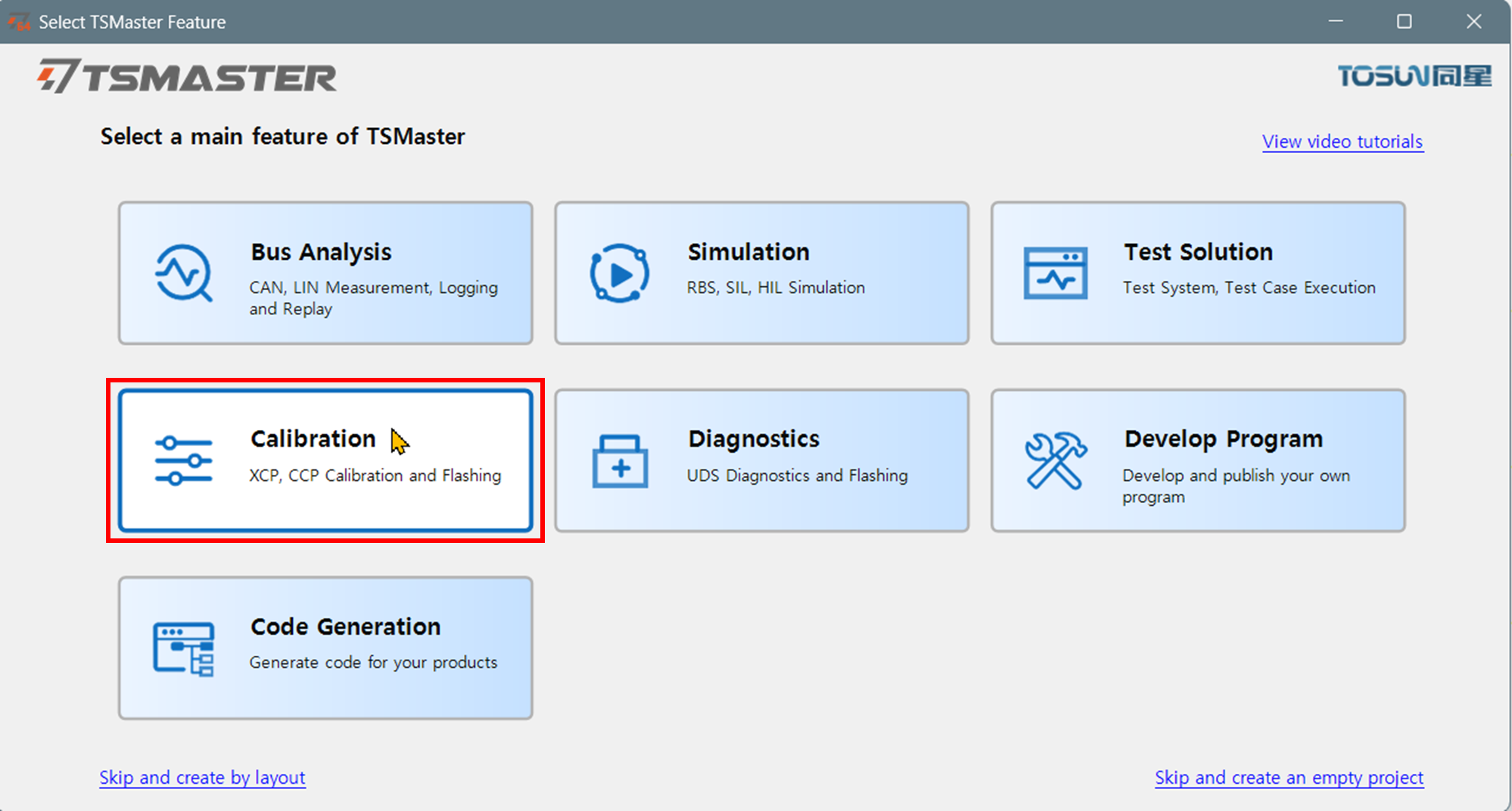 - Select a main feature of TSMaster 창이 열린다. Calibration을 선택한다.