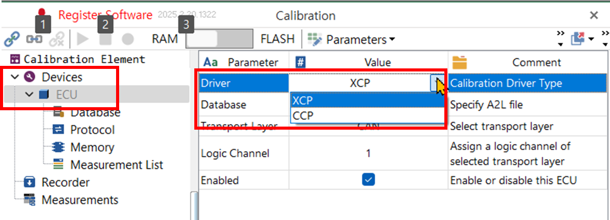 Download/ Upload 설정. 차이 없다. - 위에서 설명에 빠졌다. XCP가 아닌 CCP 프로토콜을 적용하는 경우, Driver에서 CCP를 선택할 수 있다.