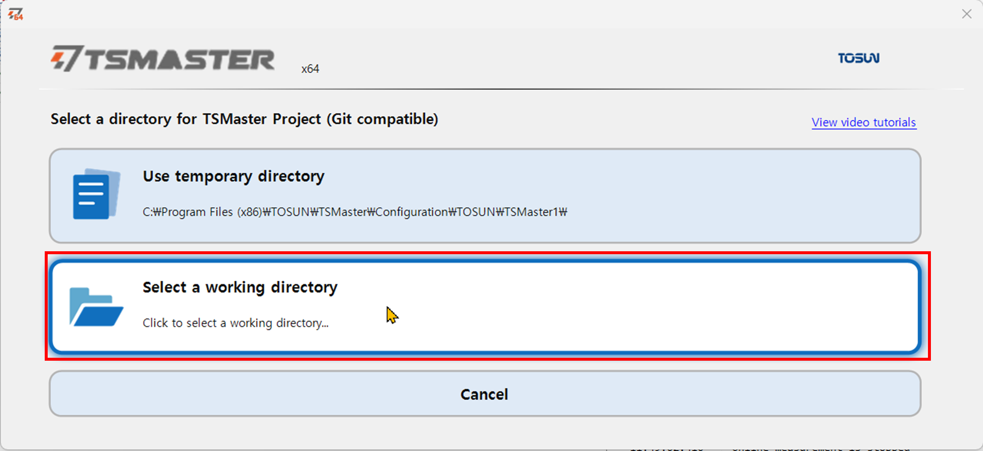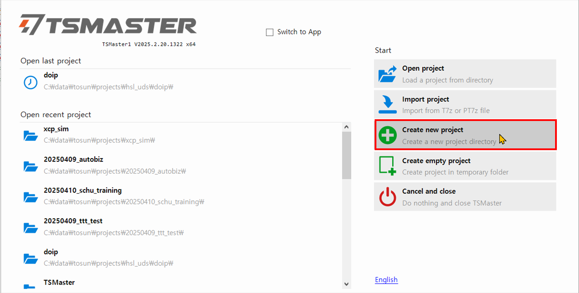 - TSMaster를 시작한다. 시작 화면에서 오른쪽 Start 그룹 아래 Create new project를 클릭한다.