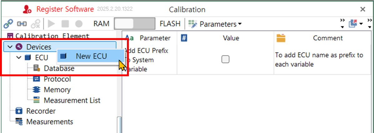 - 만일 Devices 아래 것도 없다면, 아래 그림과 같이 Devices에서 마우스 우클릭하여 New ECU를 선택하여 ECU를 추가한다.