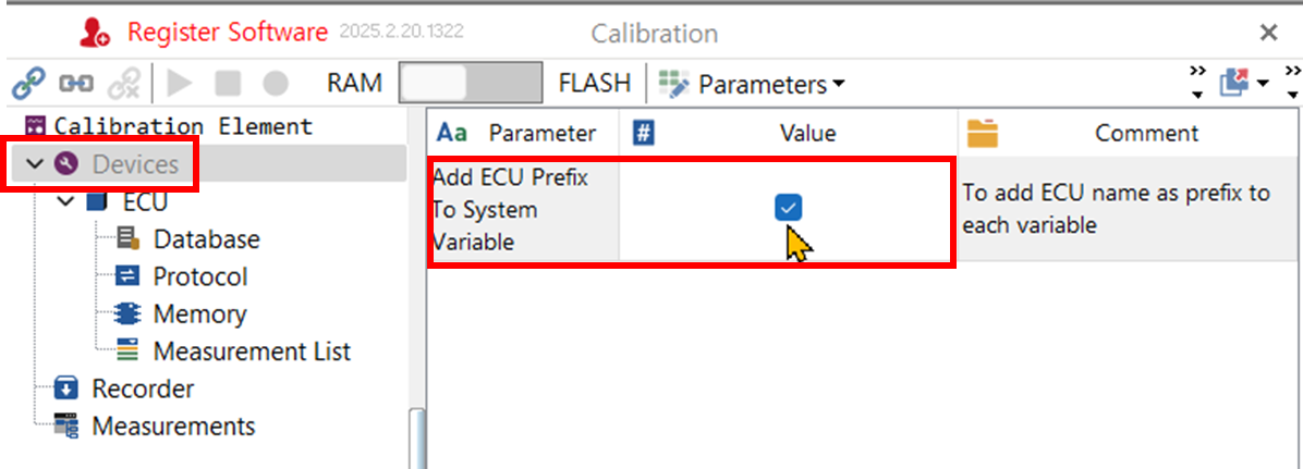 - Device를 선택한 상태에서, 상세 창에 Add ECU Prefix To System Variable을 체크할 수 있다. (TSMaster의 작동 방식을 추측해 보면,) 사용자가 모니터링이나 캘리브레이션을 하려고 선택한 제어기의 각 변수나 각 파라미터에 대응하는 TSMaster의 시스템 변수가 생성된다. 이 시스템 변수들의 이름은 제어기의 변수/ 파라미터와 동일하다. 만인 Devices 아래 ECU와 ECU_1이라는 두 개의 제어기가 있고, 두 제어기에 동일한 이름의 변수가 있다고 가정하자. 그러면 시스템 변수를 보고 어느 제어기의 변수인지 알 수 없다. 이럴 경우, 시스템 변수 이름 앞에 ECU 혹은 ECU_1 이라는 접두사가 붙어있으면 구분이 쉽다. 이 접두사 여부를 체크한다. 제어기가 하나 밖에 없을 경우 공연히 시스템 변수 이름이 길어진다는 단점이 있다.