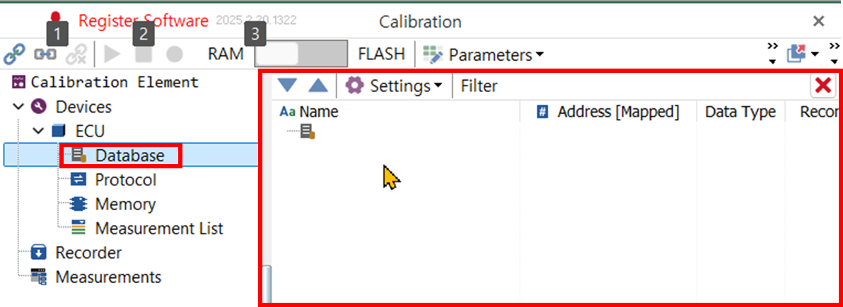 - XCP 통신에 a2l을 연결하기 위해 캘리브레이션 요소 영역에서 Decives/ ECU를 선택한다. 상세 영역의 Database에서 파일 열기 버튼을 클릭한다.