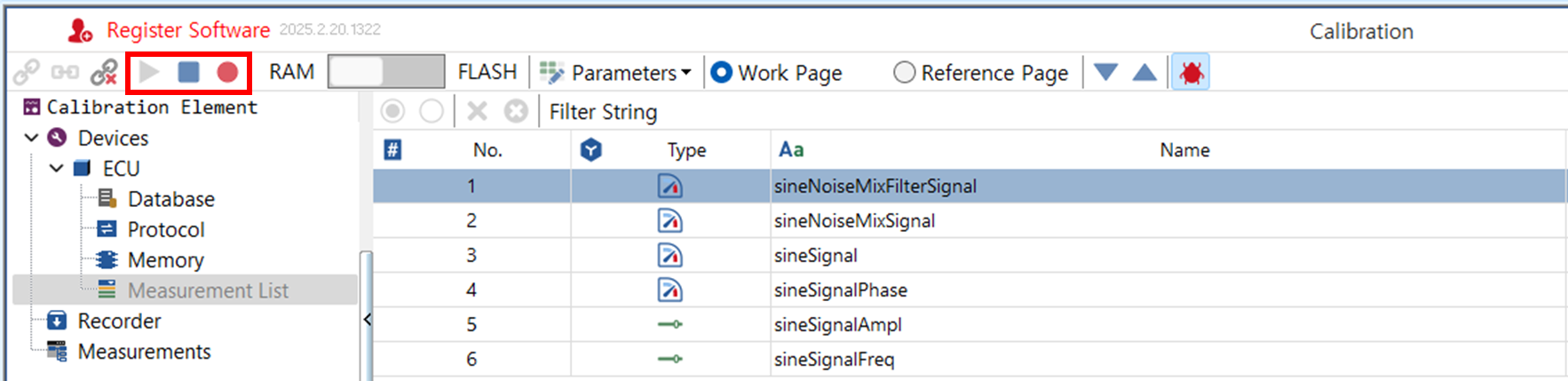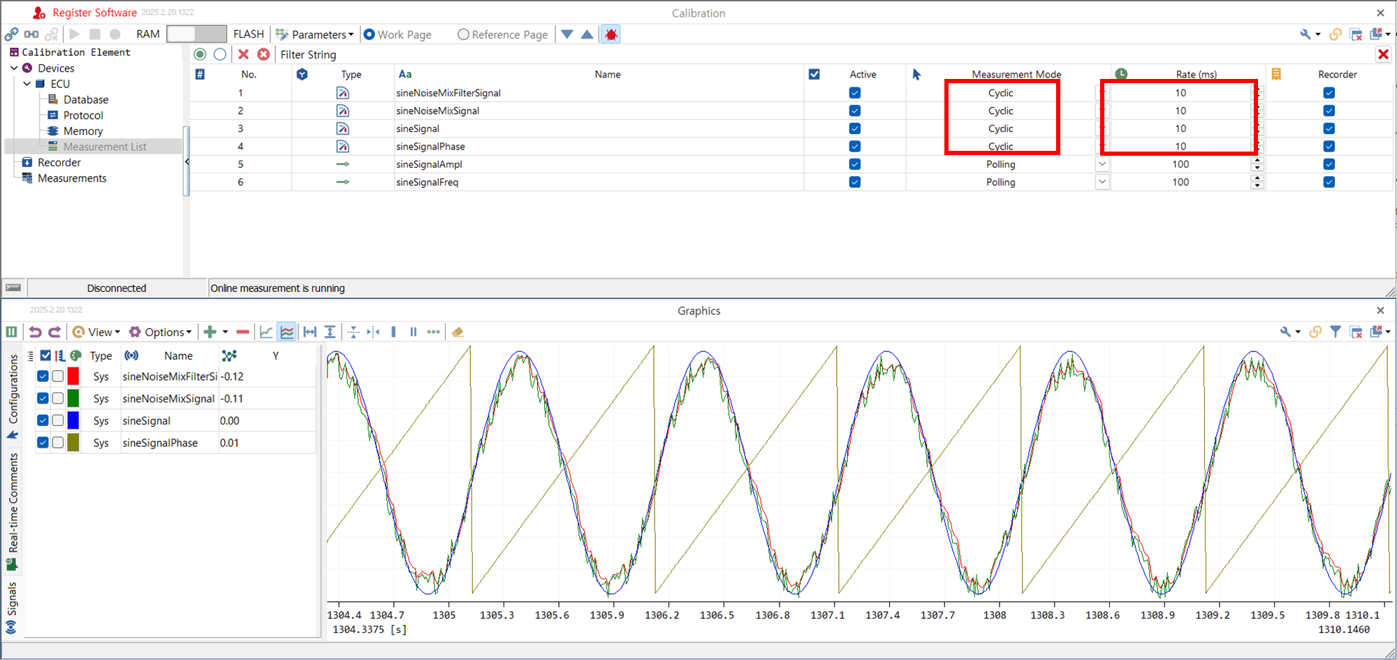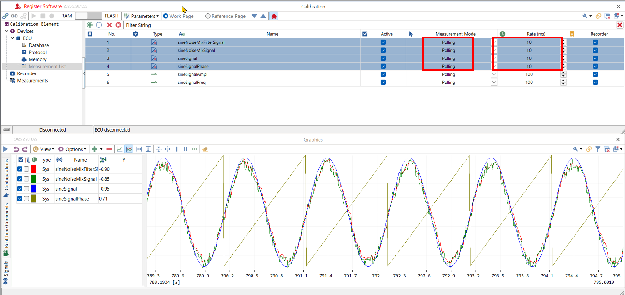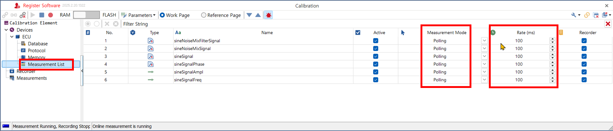 - Measurement list를 선택하여 변수들 보면 Measuremetn Mode가 Polling으로 Rate(ms)가 100을 되어있다. Rate를 10(ms)로 변경하면 매끄러운 그래프가 될 것이다.
