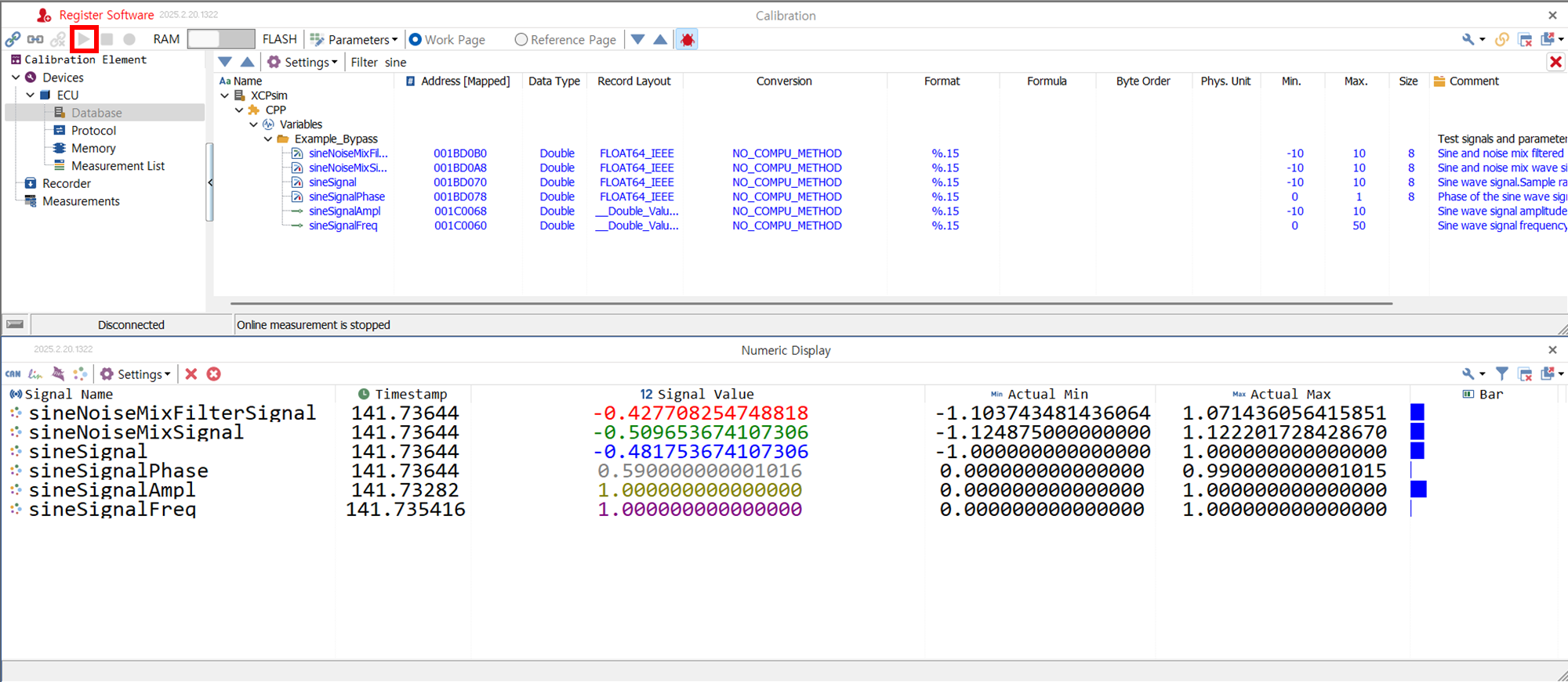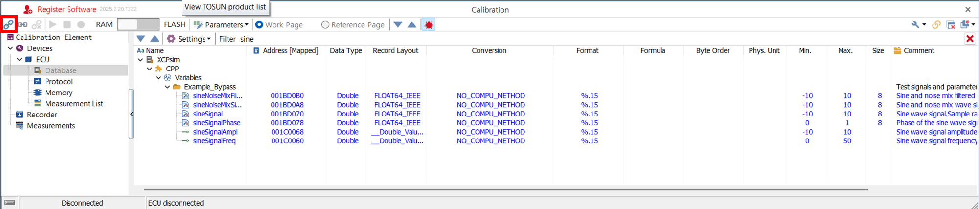- Calibration 창에서 Connect to Calibration ECU 버튼을 클릭한다. CAN 통신이 연결되어 있지 않으면 먼저 CAN 통신이 연결된 후 XCP 연결이 이뤄진다.