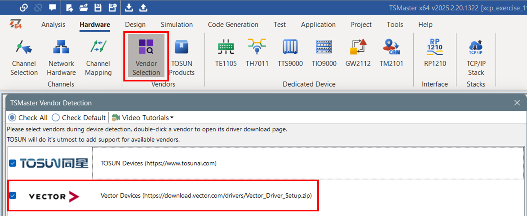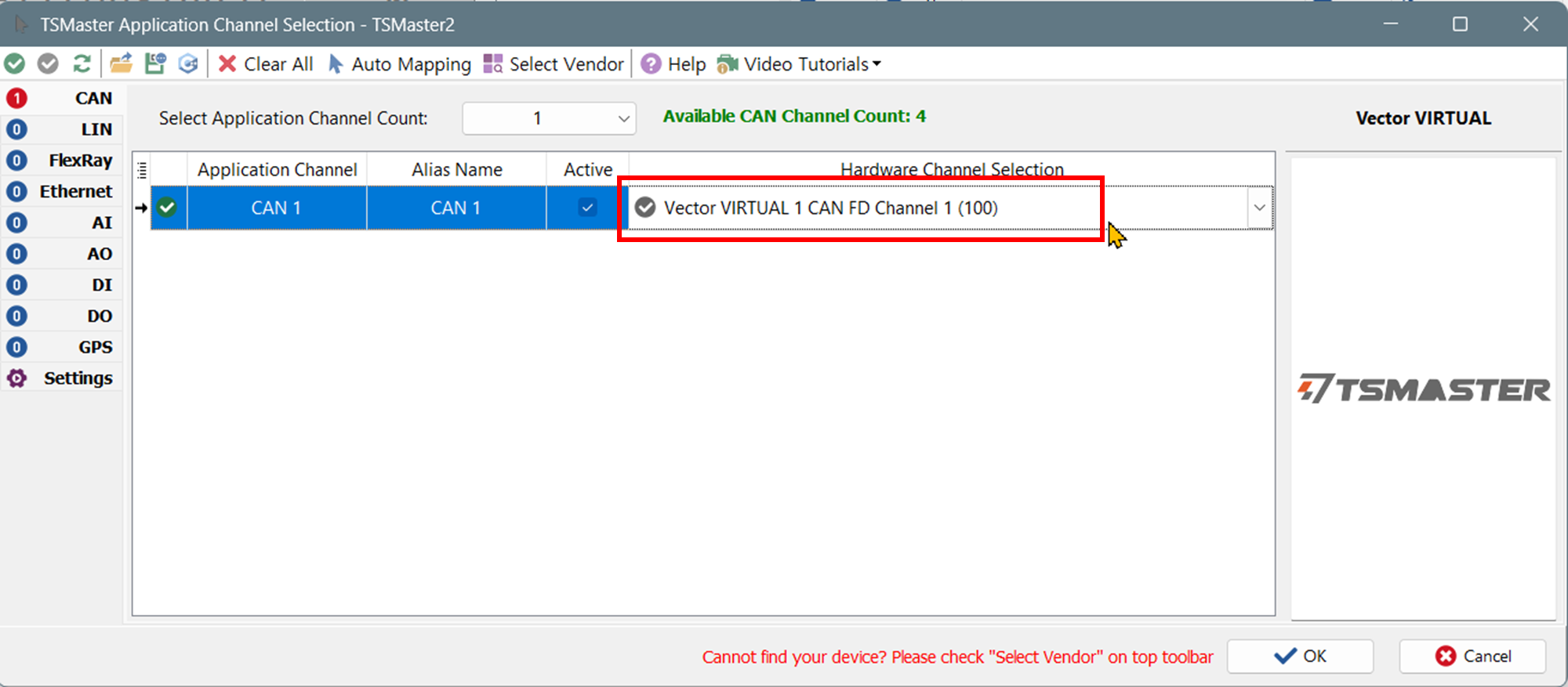 - Hardware Channel Selectin에서 "Vector VIRTUAL ..."이 표시되지 않는 경우, 메인 메뉴/ Hardware/ Vendor Selection에서 VECTOR를 선택한다. VECTOR가 선택되었는데도 문제가 발생하면 해당 url에서 드라이버를 다운로드 받아 설치한다.